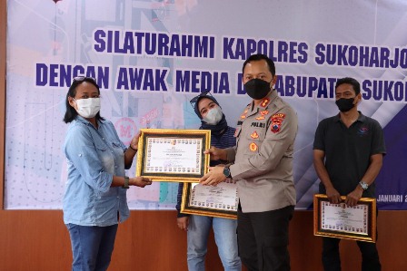 Sukoharjo – Kapolres Sukoharjo AKBP Wahyu Nugroho Setyawan menyerahkan piagam penghargaan terhadap karya tulis jurnalis di wilayah Kabupaten Sukoharjo, Selasa (25/1/2022). Penyerahan piagam dilaksanakan di Rumah Makan Dhamar Roso, Sukoharjo.