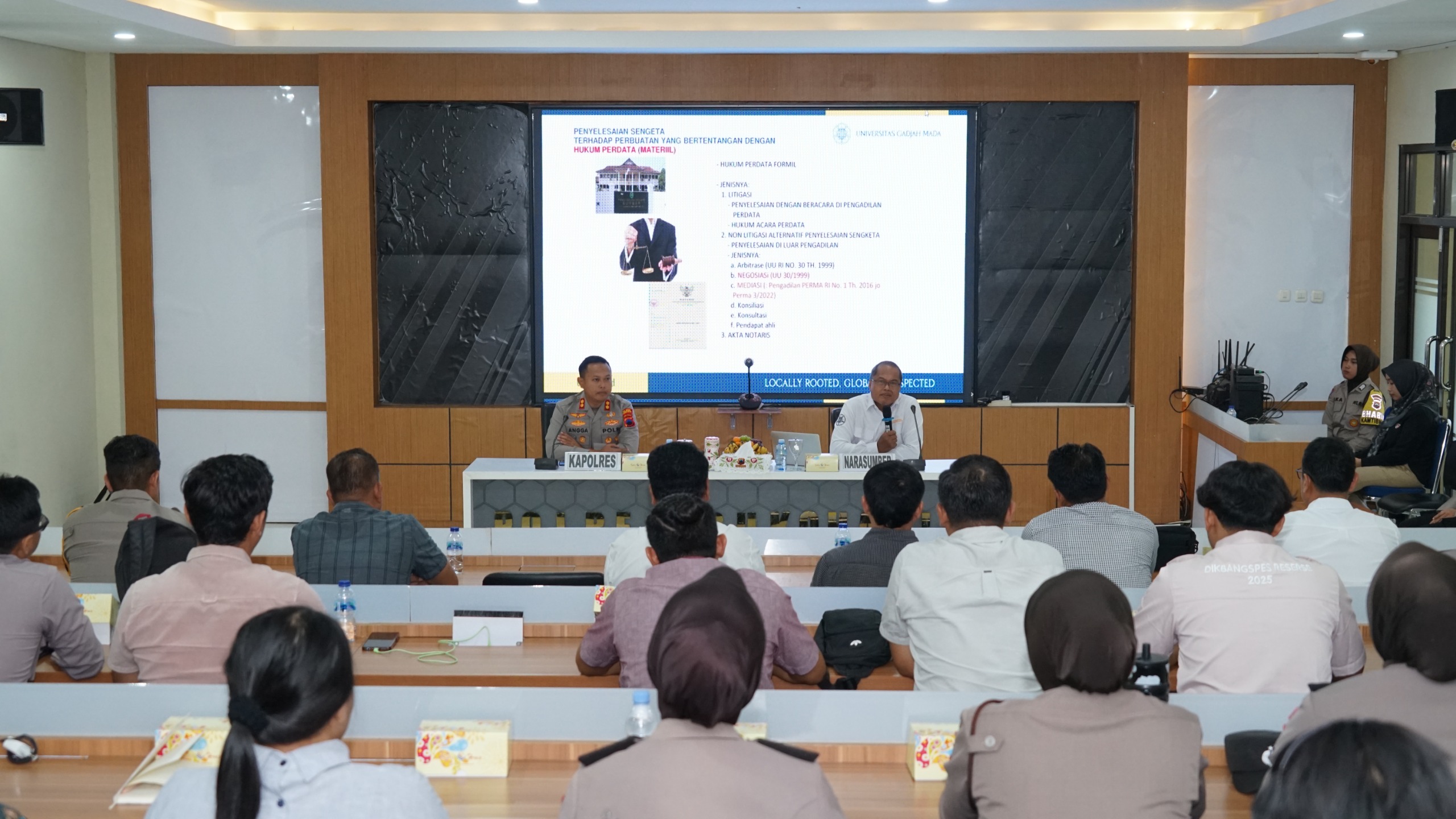 Kegiatan ini menghadirkan narasumber Prof. Dr. Tata Wijayanta, S.H., M.Hum., Ph.D., Guru Besar Fakultas Hukum Universitas Gadjah Mada (UGM), yang dikenal sebagai pakar hukum acara dan alternatif penyelesaian sengketa. Dalam forum tersebut, Prof. Tata menyampaikan materi utama bertajuk “Mediasi” sebagai instrumen penting dalam penerapan keadilan restoratif.