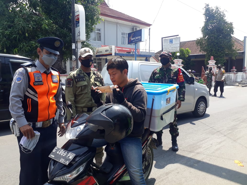 Operasi kali ini dilaksanakan di depan Kecamatan Gatak, Kabupaten Sukoharjo. Satu persatu masyarakat yang melintas tidak memakai masker dihentikan petugas.