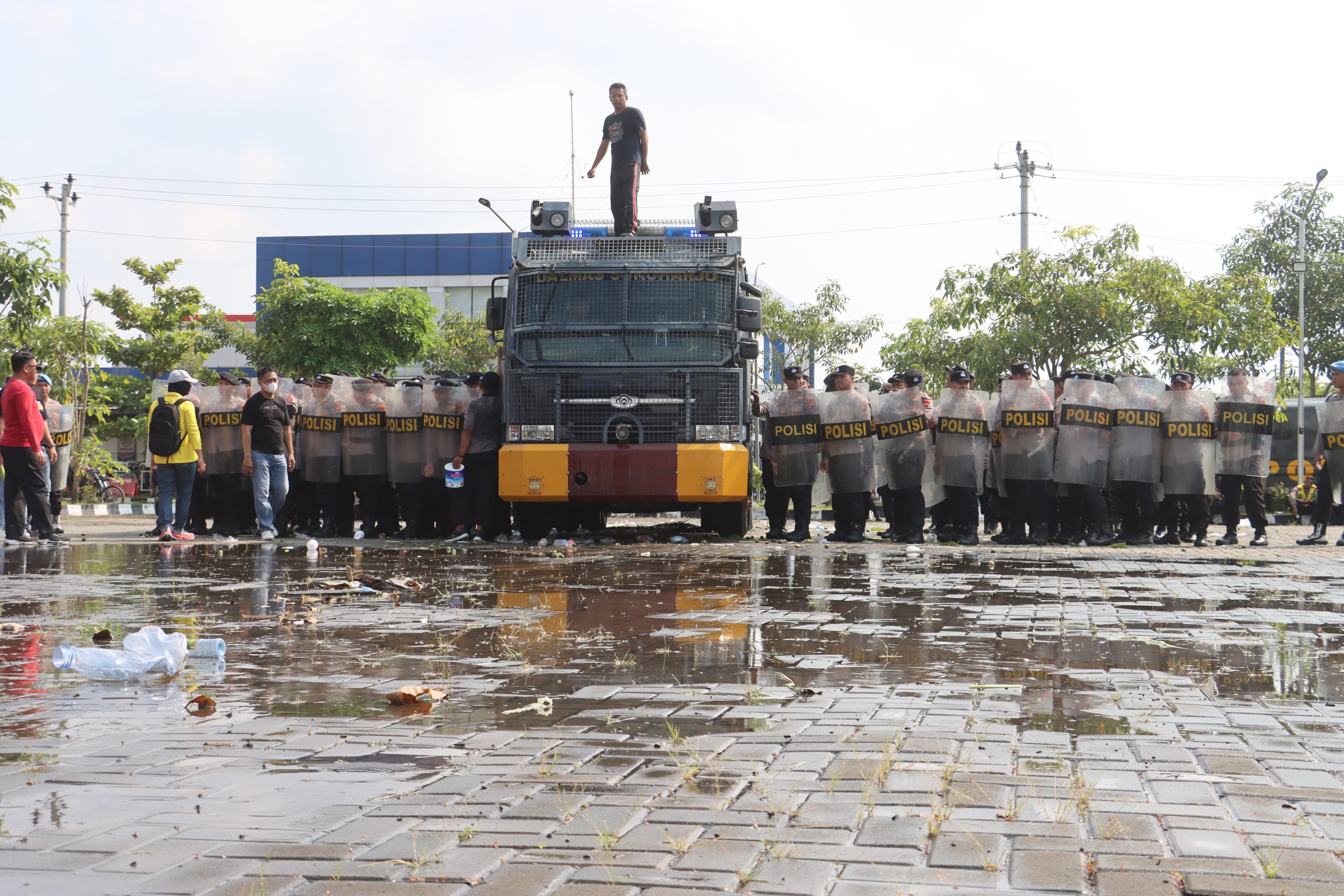 Barisan Dalmas dengan perlengkapan lengkap seperti helm, tameng, dan pelindung tubuh terlihat berdiri rapi di bawah terik matahari. Disiplin dan kekompakan menjadi kunci utama dalam latihan tersebut, mencerminkan kesiapan menghadapi berbagai kemungkinan di lapangan.