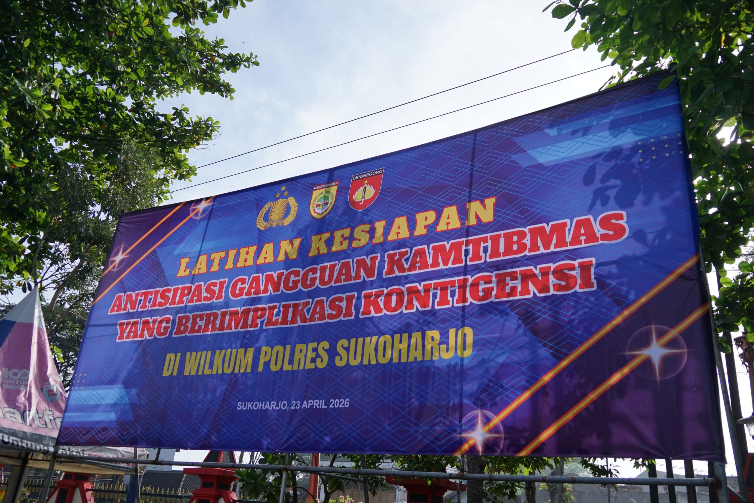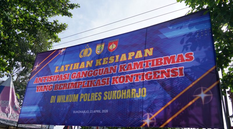 Sukoharjo – Forum Koordinasi Pimpinan Daerah (Forkopimda) Kabupaten Sukoharjo menghadiri apel latihan kesiapan Polres Sukoharjo dalam rangka mengantisipasi gangguan kamtibmas yang berimplikasi kontingensi, Kamis (23/4/2026). Kegiatan tersebut digelar di halaman Setda Kabupaten Sukoharjo, Jalan Jenderal Sudirman, Kelurahan Jombor, Kecamatan Bendosari.